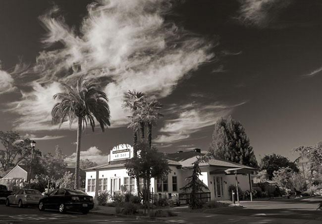 The Yountville image above is one of Keller’s resturaunts, which I dined at. I first had to wait about 1/2 hour for the clouds to drift into place. My first look and the sky was a vacant but clear blue, then I noticed a little cloud floating into the image. So looking around the big tree on my immediate left, I saw the rest of the cloud formation that was on the move and decided that these clouds would frame the palm trees much better. Yes, this is the palm tree image that I mentioned a number of days ago.