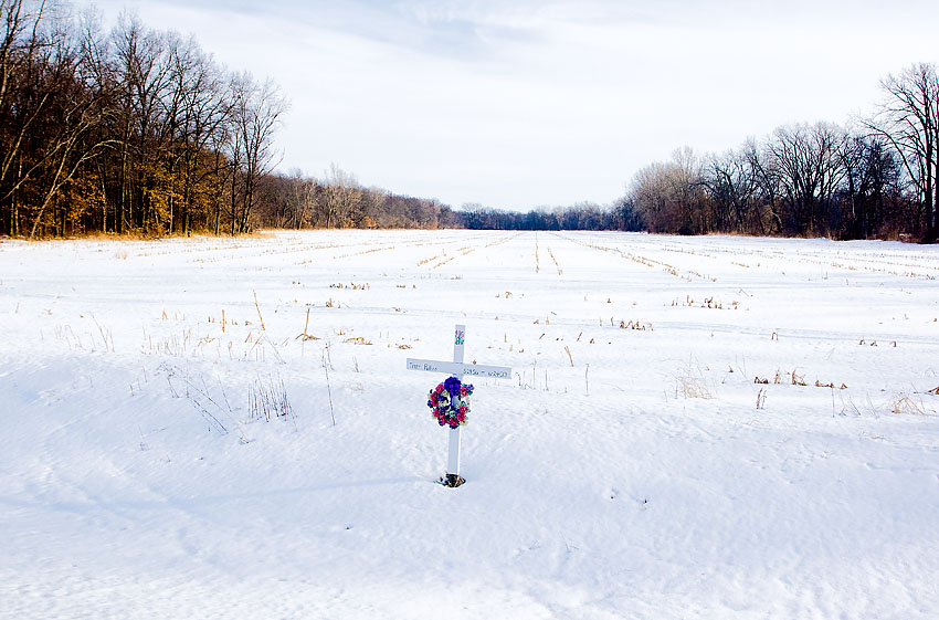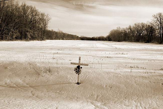 As to this image, it was made the late afternoon driving East on Indiana State Route 30 heading towards Warsaw, Indiana. This cross was just the other side of the roadside drainage ditch, but in front of the corn field that was cut and slightly covered with snow. It was a retty desolate looking scene. I was struck by the moody sky and the expanse of cut field, perhaps symbolizing death & decay, but with a pending rebirth with the Spring replanting. And it actually looks more like I intended after going through a re-development of the RAW image with my CS3 B&W workflow (below).