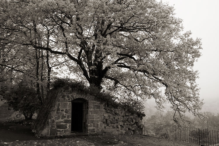 BTW, this image is from the castle overlooking Marburg, Germany while I was there at the end of October (business trip and not planned, but wonderful time and opportunity). I made this image as a gentle mist was starting to come down with Marbrug getting fogged in during the late afternoon. This small building houses a spiral stairway down the side of the castle wall to another section of the castle grounds inside the moat. And there is that big tree, which in color would be a cascade of yellow Fall leaves. But that splash of color would distract you from that small building with the dark enterance, mysterious, but not totally forbiddening. Beckoning you to enter in, explore and to discover where the journey would take you. A nice little metaphor for starting 2008, eh?