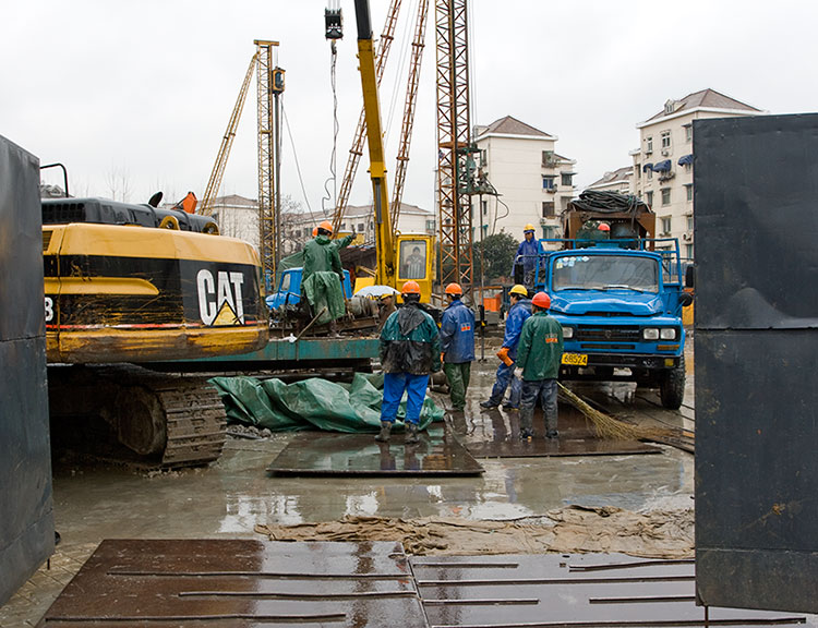 1. Your comments and images from construction sites are fascinating. There is something mesmerizing about human activity on that level. In this photo, I especially like the intense contrasting colors in the foreground standing out against the neutrals in the background as well as the concentration and energy in the human figures playing against the gray and sodden setting. Very effective story-telling.