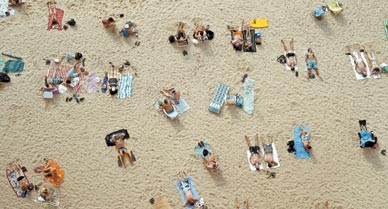 A couple of excepts: So even his picture of a lone couple on a beach can be vaguely unsettling: their isolation underscores their vulnerability, and the photographer’s long-range viewpoint is clearly that of someone watching….he scannned th negatives into a computer, and sometimes digitally removed people, heightening the feeling of isolation.