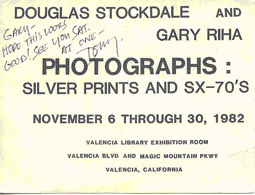 Back in 1982, Gary Riha and I had our first two person exhibition at the Valencia library in Southern California. We both exhibited our silver gelatin prints and I also include a series of SX-70 (Polaroid) prints. If I recall, as that was a while ago, the subject of our black and white photographs was the natural landscape, while the subject of my SX-70 images was the urban landscape. I think that the largest print in this exhibit was 11 x 14″, with archival white mattes, usually in a metal aluminum frame.