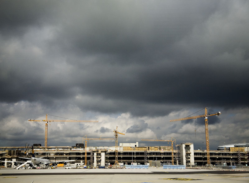 Walking through the Frankfurt International airport, I glanced to my left and stopped dead in my tracks. What a beautiful sight! I am not sure why I find these industrial construction sites so fascinating, but I do. I think I can trace my current interest in these industrial landscapes to my project in China, where there was a sky full of cranes and construction equipment.
