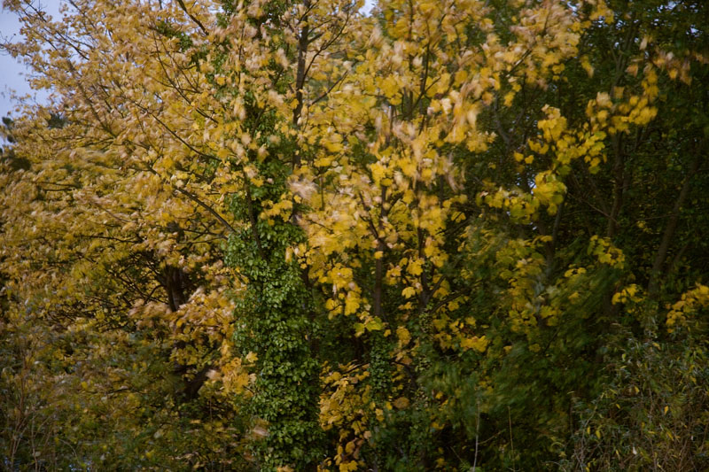 On the late afternoon train from Wrexham (Wales) to London, I had passed well into England when the train made a brief stop (not sure where) and I recognized that the light breeze moving the leaves would create a mildly abstract composition with a longer shutter speed. So I stepped down the aperture a couple of more stops in the late afternoon light and the results are about as intended. The subjects are recognizable but different, maybe a little distrubing or not “right”, nor what we could visually perceive. nice.