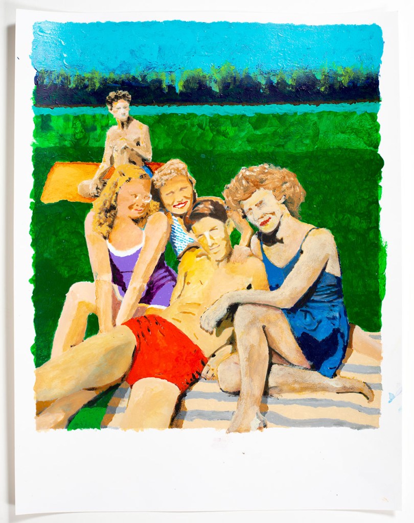 This painting is based on a vernacular (family archive) photograph set in the mid 1940’s. I am only sure of my mom in this painting while I recognize two of the others who appear through out her archive from this same period. I have checked in with other living family members who have Pennsylvania roots and they don’t seem to have a clue as to who the others are. sigh. How it goes sometimes with a family history; gaps as to who is who and what the heck was going on and where. Which becomes a family mystery.