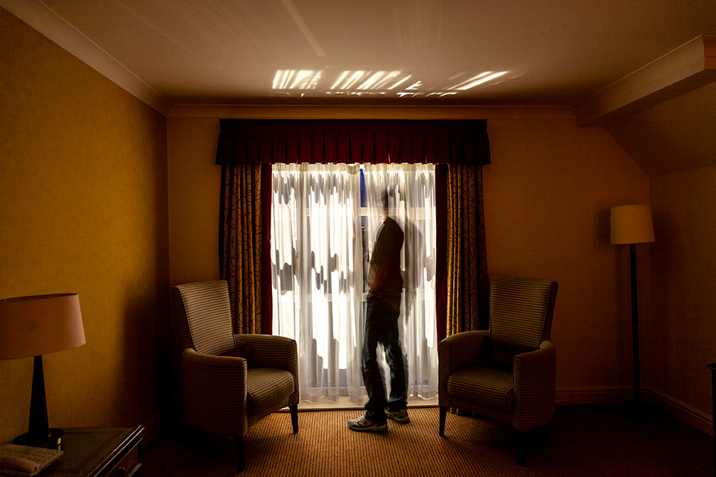 As to the staged photograph in this article, I was investigating the transient nature of bouncing from hotel to hotel, city to city, country to country as a part of a day-job. We are but ghosts who haunt hotel rooms. This photograph is on of my short-list for the book-dummy. That the subject is blurred and not well defined, increases the ambiguity and unease, which provides some visual tension that relates to the potential anxieties that accompanies this type of business travel.