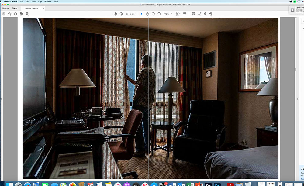 I believe that the very first fix you will want to implement with your new Blurb book-dummy PDF is use the Acrobat Pro function to “Organize Pages” and either add one additional page or delete one page from the beginning of your book dummy after the cover. More than likely, Blurb has inserted a blank white page between the cover and the text block. Then click Close and go back to the two-page view and now your book dummy should now be entirely in sync. A photograph that is intended to be a two-page spread will now look like a two page spread (see second screen shot below). For me, this was the most glaring deficiency with the Blurb PDF, but then again, Blurb wants to sell expensive physically printed books and not an easy to use PDFs. duh.