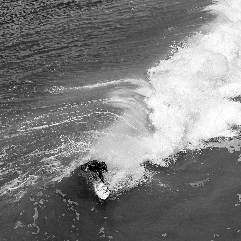 Another take on the San Clemente surfing photograph that I just posted. I had provided myself with an interesting idea about placing more focus on the surfer by eliminating the other surfers in the background. Actually it was pretty easy with the cloning tool on a Duplicate adjustment layer. Done. Since I was cloning out the background surfers, while I was at it I also downplayed some of the white water highlights in the bottom left corner to reduce the distraction from my subject. Done.