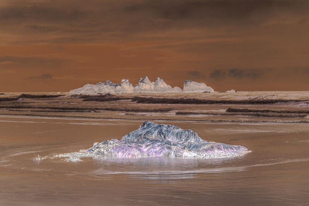 This new series came about while preparing for the LACP Exposure weekend, during which I was also going to meet-up with some curators that I did not know. From past experience for conceptual series, I know that curators appreciate an overview, as well as sometimes a working title for a specific image. So I have been thinking of some titles and when looking at my Warming Water series, I had included some large rock formations in the foreground. When inverted these black rocks became really white edifices and my first thought was these are white hot from the global heating. Then looking at some photographs that included these white structures that are in the midst of the sea, it was like these were floating; just like an iceberg. Thus one idea morphed into another and this series sprang forth. Cool!