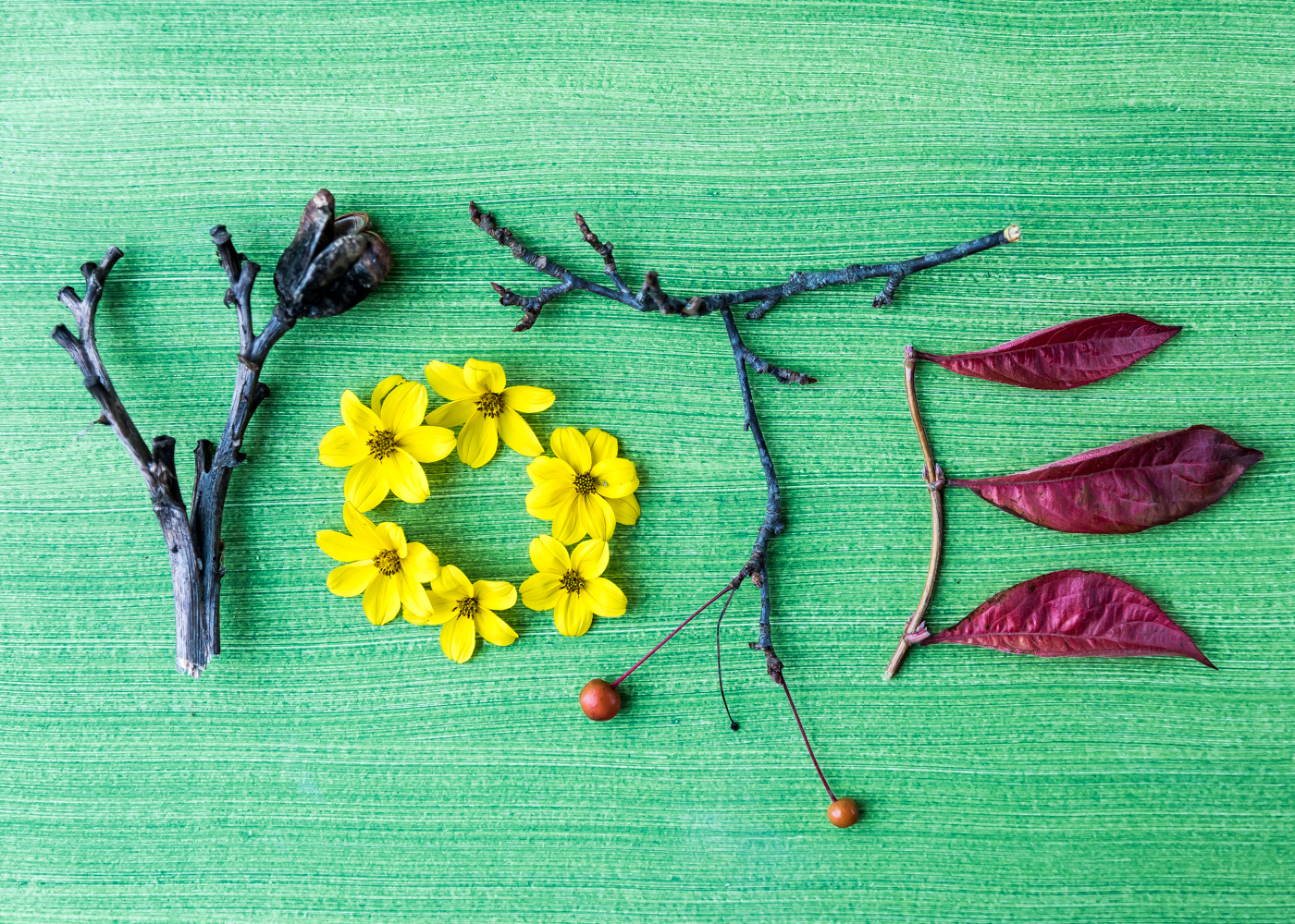 As Kerry Michaels and I were finishing our discussion this weekend, she asked in the waning last minutes if I had time to look at a fun botanical project she was working on. Of course and I am ever glad I did. She is developing a series of botanical arrangements that spell out VOTE. So cool. My immediate reaction is that I wanted to feature one right now and of course start featuring it again this coming September/October when voting in the U.S. 2022 mid-term elections is critical to protecting and enhancing our environmental polices. We only have to look back at the four years of the previous administration to realize our fragile our environment polices and protection are. Of course a version with a green background really resonated with my environmental focus.