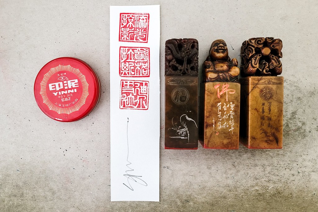 By this point for those who have followed along, it’s obvious that I do have one carved ink chop for the project; Liu Guan Lue Yin, which is at the top of the sample (test proof) that I made on a sheet of Kozo, above. This could also be a cool opportunity to incorporate a couple of other chops that I had a Chinese artist carve for me while in Shanghai; Douglas (the middle chop mark) and Stockdale (the bottom chop mark). Maybe also sign this bookmark in graphite (pencil) as well to provide a little more aesthetics.