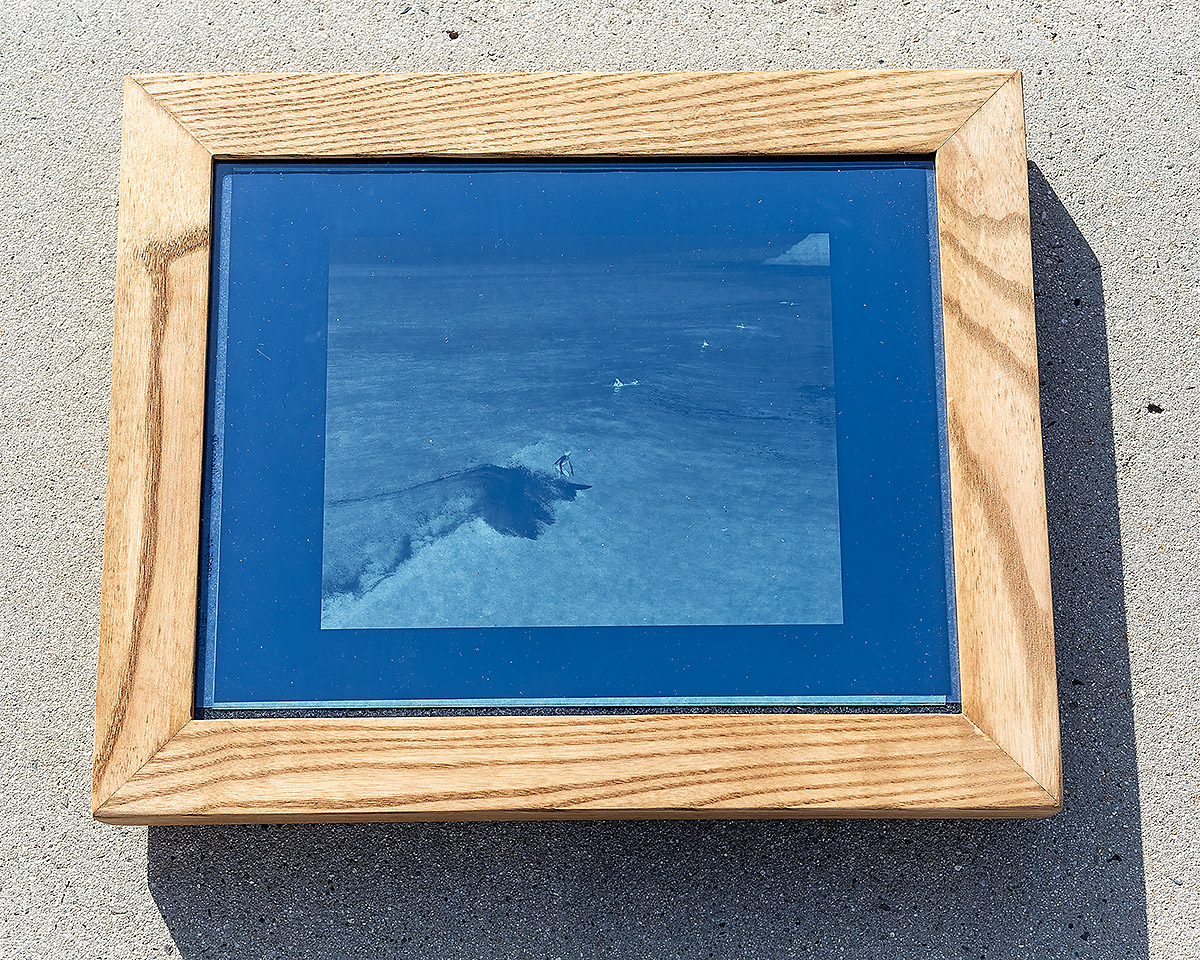 Thus the digital negatives I make can be used for a variety of alt printing methods; Cyanotype, Platinum/Palladium, Gum, etc., although for a tri-color gum print, I would need to create three slightly different digital negatives. So at this time I am using it to create some Cyanotypes with mono-type digital negatives, the first few from my Surf-Rider series. I don’t require a printing frame to contact print botanicals, such as my very first Cyanotype, nevertheless I can foresee how I might combine these two; digital neg in the frame, then something like some seaweed laying on top of the glass. hmmm.