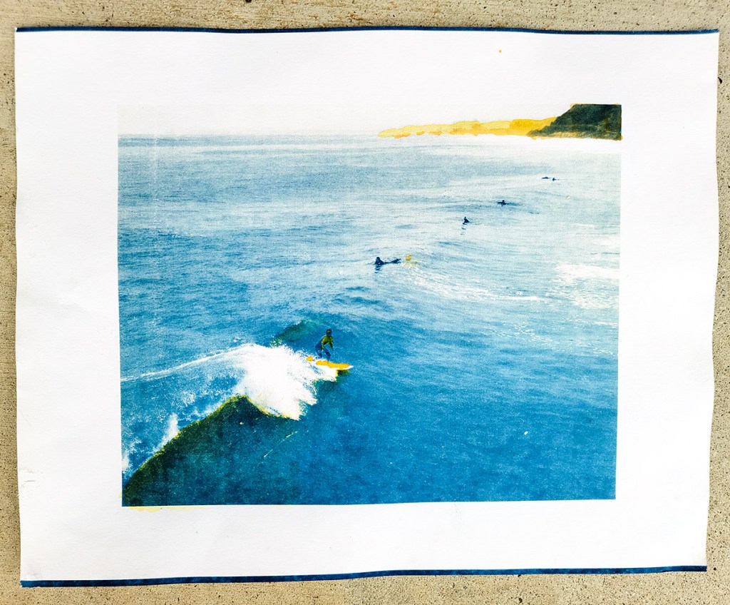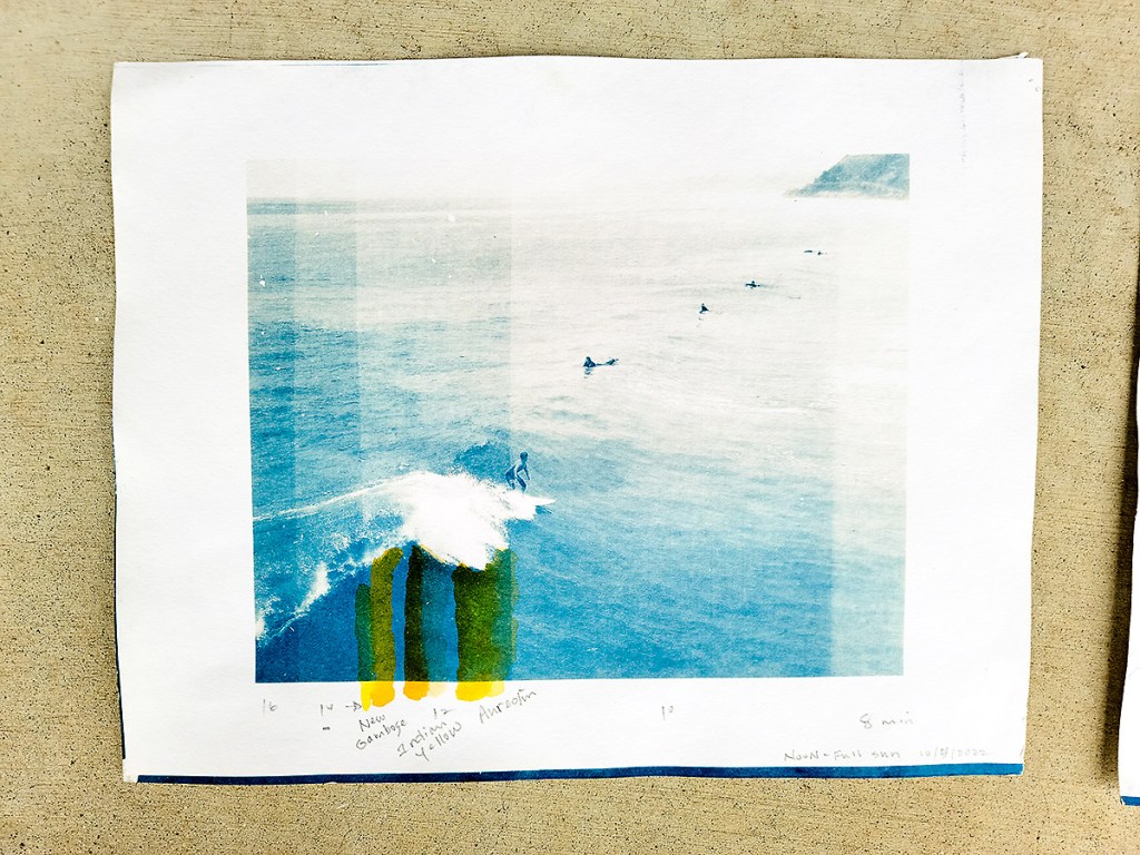 I have found that the cyanotype printing with my seascapes allows me to predominately use the cyanotype blue for the majority of the print (water and sky) and I only need a little bit of color here and there. So as we say in science, I needed a proof of principle, aka known as continuing the cyanotype artistic learning curve. So having a couple of test prints for my first cyanotype, Surf-Rider I, there is something for me to mess around with…cool!