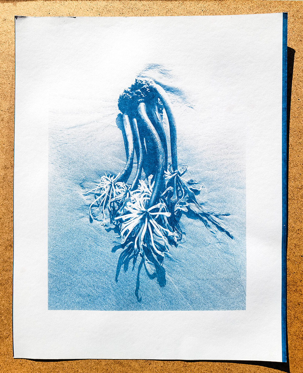 As I started to photograph the various combinations of seaweed washed ashore on the beach, I was hit with the idea that these combinations might also make a wonderful cyanotype series; things that came about due to the deep blue sea. While in Bandon I created some quick comps of the seaweed formations that I had photographed with my mobile phone and uploaded to Snapseed as a potential what-if. These blue-toned digital ‘cyanotypes’ looked great. My next step was to upload a few of my digital ‘cyanotypes that I made in Bandon to my Instagram (@douglasstockdale) and the IG response was extremely encouraging.
