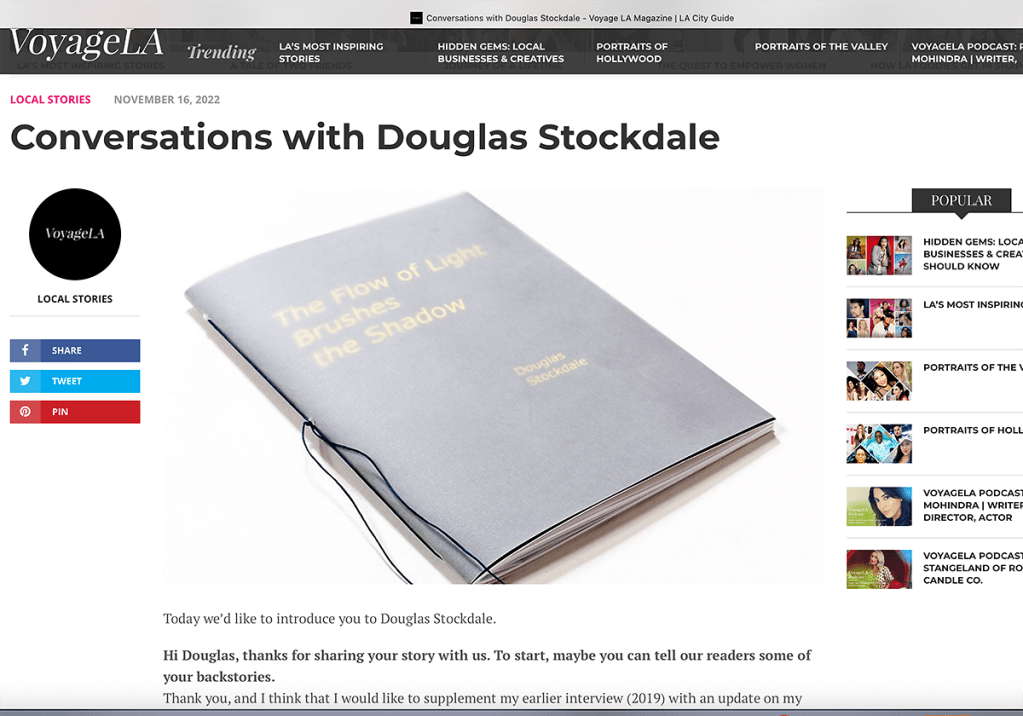 What a nice surprise this morning as I was greeted by Voyage LA Magazine‘s feature of my and my artist book, The Flow of Light Brushes the Shadow. Of course I knew that this article about my artist book was going to be published as a result of their interview, it’s just that I can never tell exactly when the interview will be actually published. Cool!
