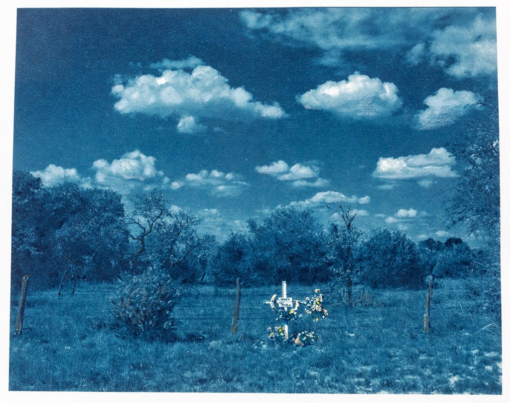 This particular urban landscape came to mind first for me due to the on-going deterioration of this Texas roadside memorial. As I witness what occurs with many of these roadside memorials is that after the initial grief and response due to the sudden circumstances to this deadly event, over time, these sites and memorials are not maintained and eventually have a passing of its own. The plastic flowers become wind-blown and sun faded, while other parts of this hastily erected memorial falls victim to the natural elements. My hand-color cyanotype is a visual metaphor for the fading blue memories.
