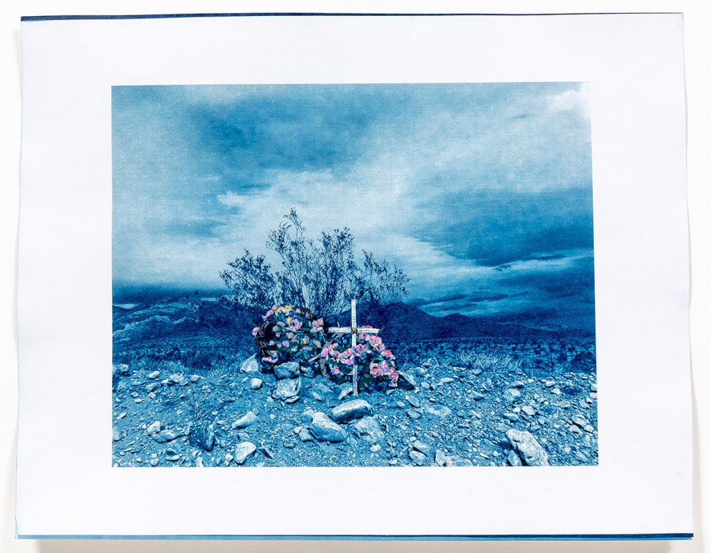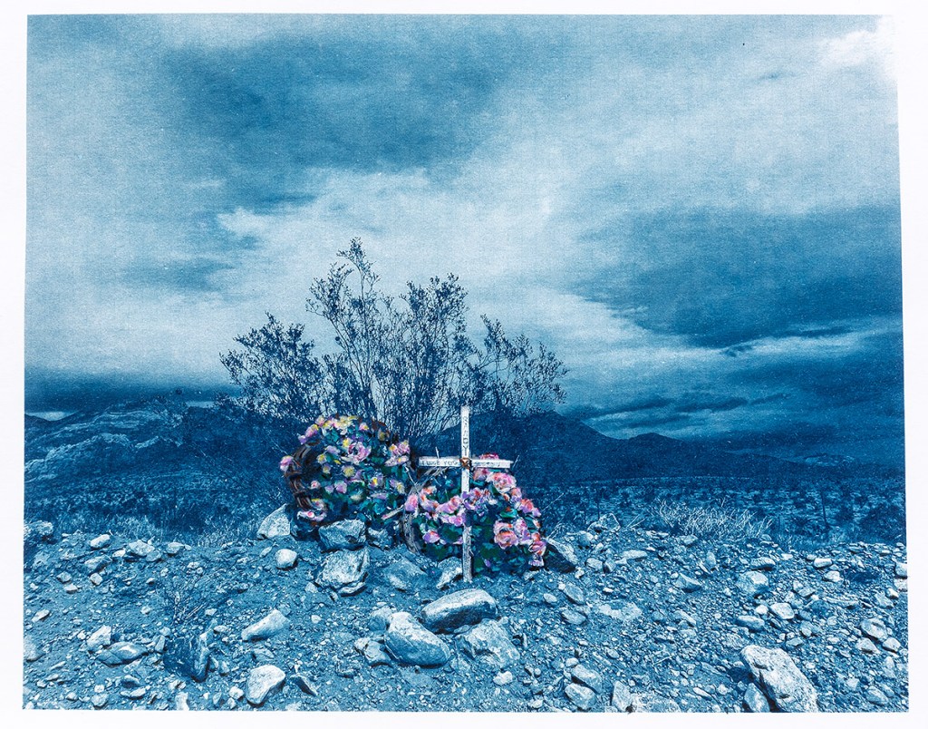 Featured artwork: Randy, Nevada Route 179 (In Passing: Lest I Forget #1954), solar cyanotype + Prismacolor pencil, unique, 8 x 10″ image on a 11 x 14″ sheet of 100 lb watercolor rag.