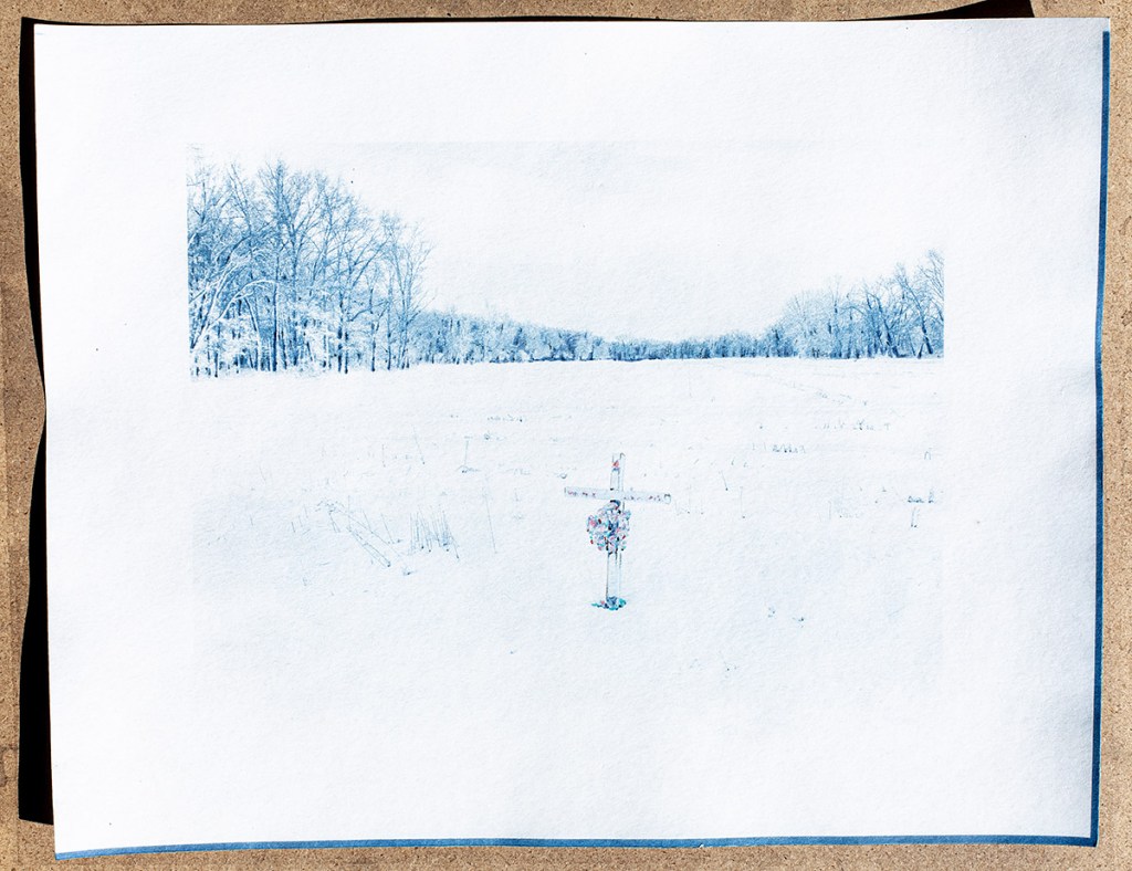 Featured artwork: Terry, Indiana Route 30 (In Passing: Lest I Forget #2108), solar cyanotype + Prismacolor pencil, unique handcolor, 8 x 10″ image on a 11 x 14″ sheet of 100 lb watercolor cotton rag.