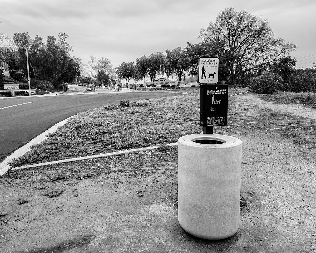 My second subject, above, is to create a reference picture that is not the usual landscape theme and might be an object that an artist might need because it is hard to find elsewhere on the internet. I am pretty sure that there are very few pictures of receptacles to obtain the little plastic bags for picking up the doggy-droppings. So I think that this also meets the Atget requirement for a reference picture; trash barrel and bag dispenser are large enough in the foreground to see the attributes of construction, includes a background reference of a walking pathway and in true Atget compositional style, the prerequisite large tree in the background framing the objects in the foreground. And last but not least, who would hang such a picture in their living room, thus it has no artistic merit as no artistic photographer would be interested in exhibiting this. Bingo! Done.