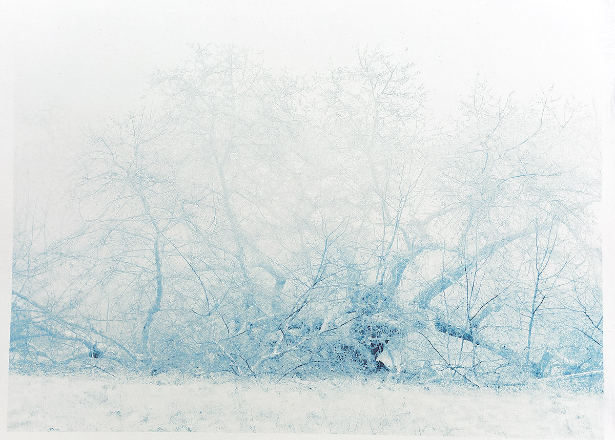 Above: ‘Sycamore, Fog, Spring‘ solar Cyanotype, image 8 x 12″ on a 11 x 14″ sheet of 100 lb Revere Platinum archival rag, Unique print in a Variable Edition of 5 + 1AP. If interest, please inquire about availability.