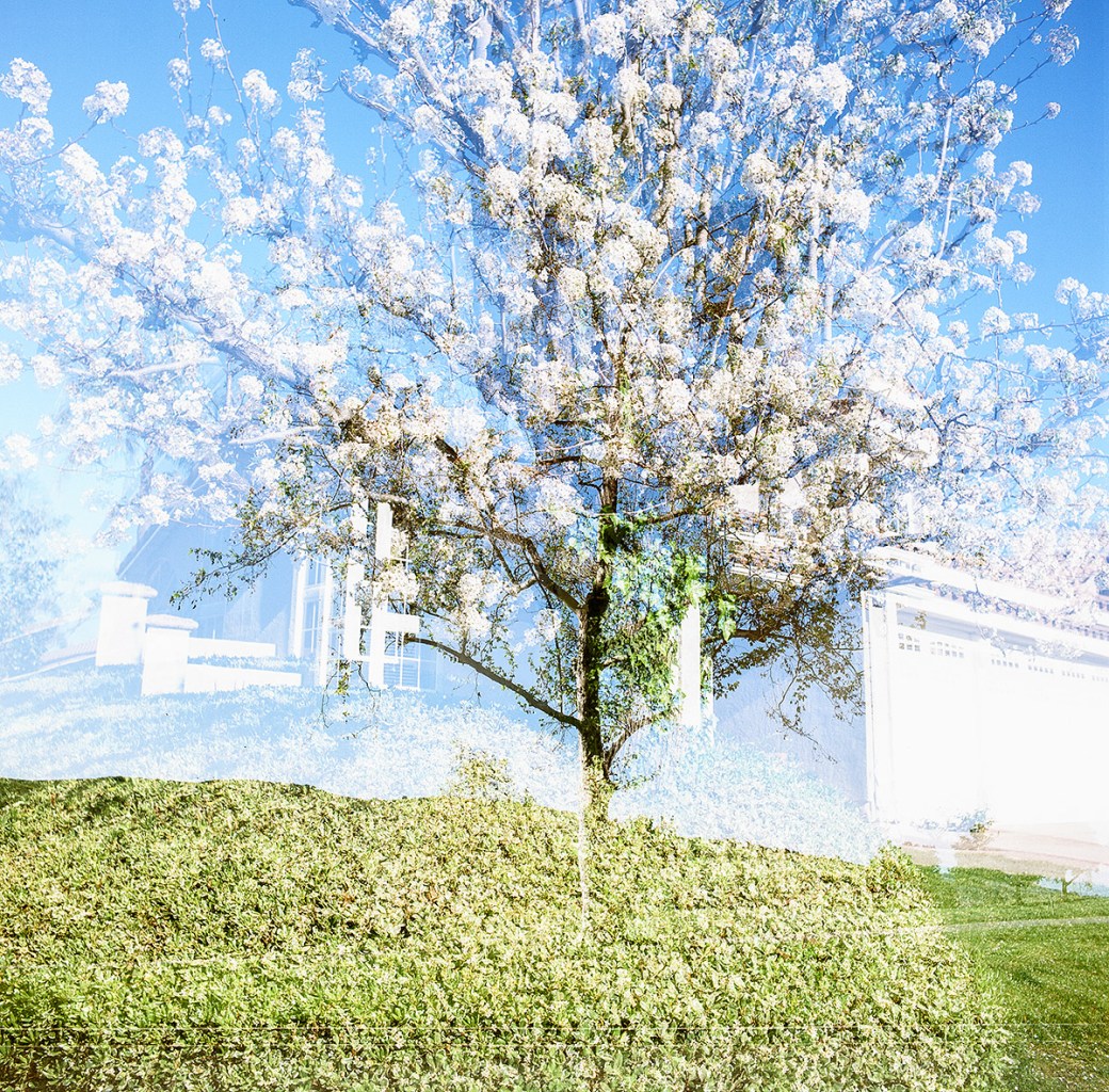 Interestingly, I had composed all of the exposures with a similar center balanced framing, thus the overlay of the multiple images stacks up in a very complementary manner. One tree is in bloom, while another was bare and just starting to bud out. Too funny, but when this film results came back, both of these trees had evolved, the large white blooms of one are gone and the other has a nice amount of spring foliage; so if I want either of the intended images, I need to remember and do this over next year. One of the downsides of using film, eh?
