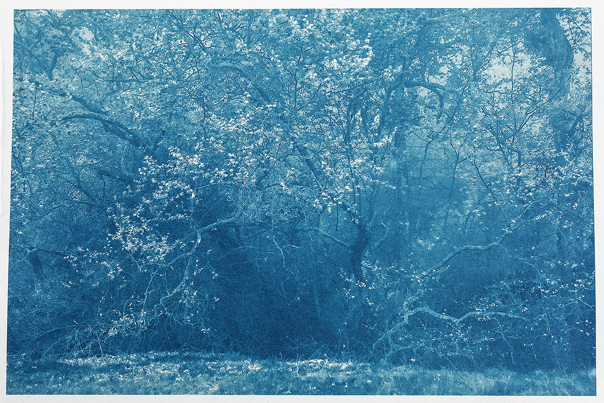 Above: California Sycamore, Spring, Fog (Into the Woods), Unique solar cyanotype print, 8″ x 12″ on 11″ x 14″ sheet of Revere Platinum rag in a Variable Edition of 5 + 1 AP