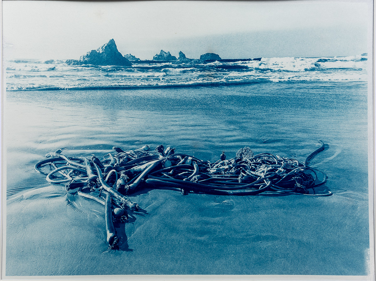 I photographed this composition while we were in Bandon last Fall for my son’s wedding. Our rental house was overlooking the beach and I could see this mass of sea kelp from the back deck. This cyanotype print is part of my developing Beach Lifestyle series (IG @beach.lifestyle.art).