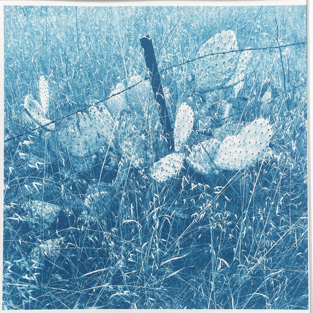 Cyanotype print, Complication (Entanglement series), copyright 2023, image is 9 x 9″ on a 11 x 14″ sheet of archival Revere Platinum cotton rag (hot press), variable edition of 5 + 1AP. Contact negative made form scanned Expired 120 color film.