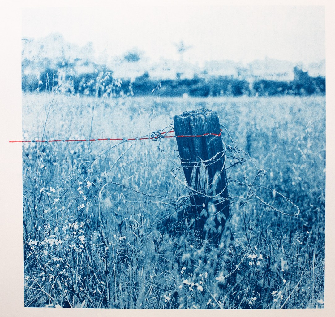 My first artist comp of this concept is below in which I had colored with Prismacolor pencils an inkjet print of one of the prime cyanotypes in consideration. For this version, I colored all of the barbed wire and since the actual barbed wire was rusted, I used a varies of Prismacolor pencils to try to make an accurate representation. Overnight, I realized that I was trying to be too realistic and that I needed to just use only a true ‘red line’. I then added another red line and since the redlining practice was extensive, then it made sense to carry my red line beyond the print’s boundary into the white margins. Cool!