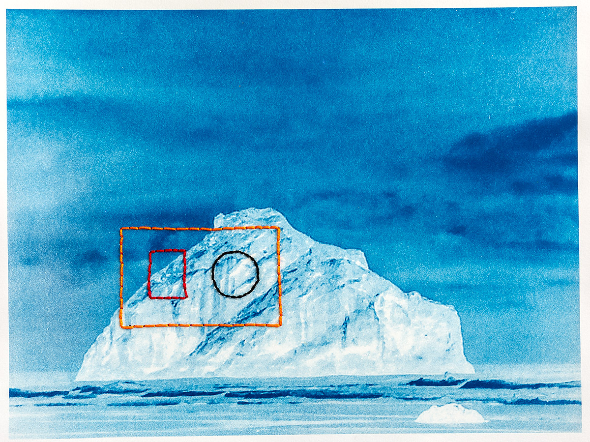 Untitled (Last Iceberg series, #101325 version #2) copyright 2014/2023, hand-sewn cyanotype image is 9 x 12″ on a 11 x 14″ sheet of Revere Platinum hot press cotton rag. Unique print.