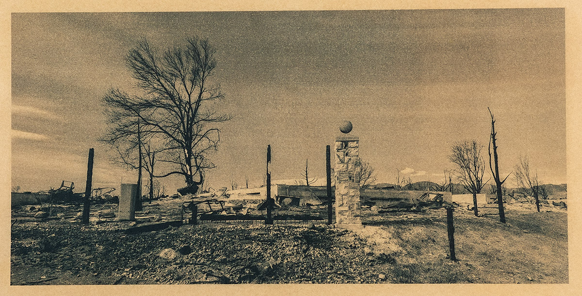 Below is my first try making a coffee toned cyanotype print and not illustrated is my tea toned print, which is a lighter version of the coffee tone print. The coffee toned print was closer to what I was pre-visualizing for this series; dark and foreboding, that the brown tone could simulate a smoky look in the aftermath of a devastating firestorm. What was most intriguing with the coffee toned print (without the pre-bleaching) is the slight split-toning of the sky. What was vexing was the toning of the highlights, as I wanted to keep some whites, while the entire sheet of paper was stained brown. So I set the cyanotype toning project aside while contemplating next steps.